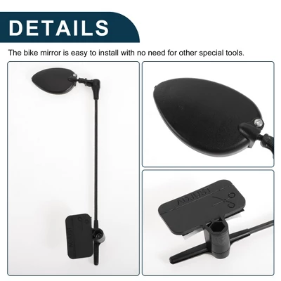 General Fit:This Rearview Mirror for Bicycle is designed to meet the expectations and provide better performance.With direct replacement fit, the handlebar bike mirror will save your time and effort on BicycleaccessoriesFunctions:Universal design for most Bicycle; They are designed to fit seamlessly with your Bicycle’s existing components without requiring any additional modifications, making installation quick, simple, and convenient.Specifictions:Color: Black;Material: ABS;Mirror Size: 5×3.3cm / 1.97″x1.3″(L*W);Handle Length: 22cm / 8.66″(L);Base Mounting Width: 4.8cm / 1.89″(W);Features:Base and mirror could adjust to any direction to help you watch every direction of your back. Provide wide field of view and is adjustable to any angle for good viewing.Clear lens provide a clearer view and increase the safety index,let you clearly understand the road conditions behind you and avoid traffic accidents.Easy to SetupRemove the broken one then place the Rearview Mirror directly.