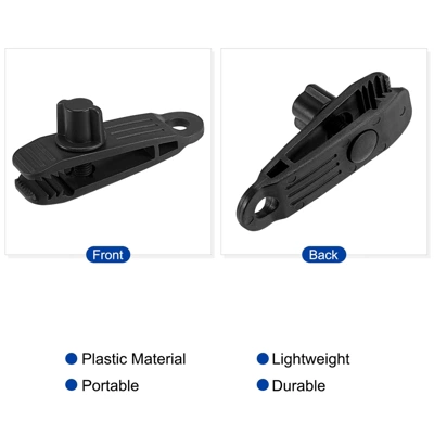 What is this?The ball elastic cords with tarp clamps kit have various applications for indoor or outdoor usages, fit for camping tent, canvases, cargo, hiking, boating, hauling, bundles, kayaks, awnings, banners, gardening, tarps, canes, canopies, tying storage, swimming pool covers and so on.What will I get?Color: BlackMaterial: Plastic, NylonRope Length: 150mm/ 5.90 inchClip Size: 82 x 22.7mm / 3.23 x 0.89 inch (L*W)Package Content: 10 x Rope, 10 x ClipAre there any advantages of this product?Made of nylon material, it can bear a large pulling force and is not easy to loose after buckling onto the objects. There are stable, windproof, wear-resistant, and long-term in use. How to use it?It’s easy to install, you need to grip the edge of the tarp, push on and screw down the jaws to grip, then to secure simply tightening or loosening the screw knobs. Pass the elastic cord through the hole of the clip and tighten up.What should I notice?Do not stretch the rope excessively and be careful that the rope rebound.