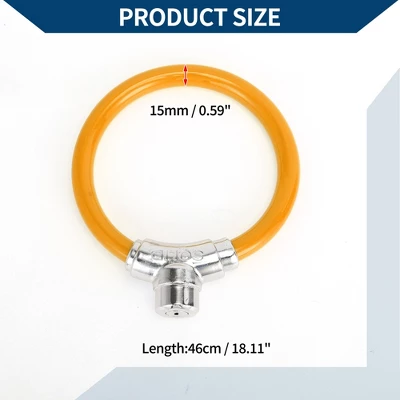UNIVERSAL:Universal Bike Lock is suitable for most bicycles.PRODUCT INFORMATION: Color: Orange; Material: Zinc Alloy, Steel; Wire Max Length: 46cm / 18.11″; Cable Diameter: 15mm / 0.59″.PERFORMANCE: Universally designed to fit a wide array of bicycle frames, this lock is good choice for urban and sports cyclists alike, ensuring secure and adaptable protection for your ride. Crafted from Zinc Alloy, Steel.The Bicycle Lock is built to withstand various weather conditions and daily use. Incorporating a sleek and modern design, this lock enhances not only security but also the aesthetic appeal of your bicycle.NOTICE:a. Please keep the lock clean and dry during daily use.b. Due to manual measurement, the size deviation is about 1-2 cm.INSTALLATION GUIDE: DIRECT INSTALL: Install directly onto your bike’s frame.