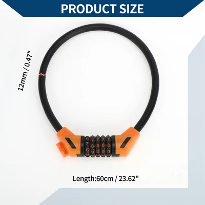 UNIVERSAL:Universal Bike Lock is suitable for most bicycles.PRODUCT INFORMATION: Color: Black, Orange; Material: Steel, Copper, PVC, ABS; Wire Max Length: 60cm / 23.62″; Cable Diameter: 12mm / 0.43″. PERFORMANCE: Universally designed to fit a wide array of bicycle frames, this lock is good choice for urban and sports cyclists alike, ensuring secure and adaptable protection for your ride. Crafted from Steel, Copper, PVC, ABS.The Bicycle Lock is built to withstand various weather conditions and daily use. Incorporating a sleek and modern design, this lock enhances not only security but also the aesthetic appeal of your bicycle.NOTICE:a. Please keep the lock clean and dry during daily use.b. Due to manual measurement, the size deviation is about 1-2 cm.INSTALLATION GUIDE: DIRECT INSTALL: Install directly onto your bike’s frame.