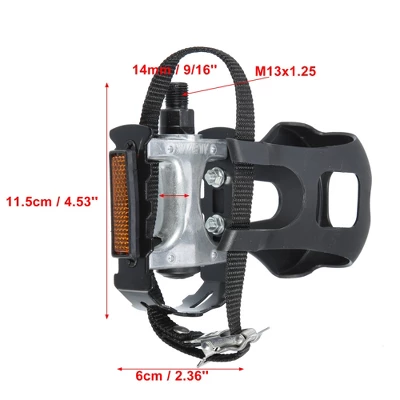 Description: L for left pedal, R for right pedal. Standard 1/2” sturdy metal axle bearing fits for most bikes. Suitable for recreational riding, BMX, cruisers bicycle, road bicycles, MTB bicycle, mountain bicycles, junior bicycle, city bicycle, etc. The adjustable strap allows you to fine tune the fit to accommodate the shoe you are using. Straps suitable for most stationary bicycles and pedal types, suitable for most foot types. Quite easy to install, the pedals and straps are clearly marked left and right, be certain to get the correct threading. Note: Please make sure that both sides of the strap are fastened and check the correction of installation before using. Specification: Material: Aluminum Alloy, Plastic; Color: Black, Silver Tone; Placement on Vehicle: Left, Right; Pedal Spindle Thread Diameter: M13x1.25; Pedal Spindle Diameter: 12.7mm / 1/2”; Pedal Size(with Toe Clip): 14×11.5x5cm / 5.51”x4.53”x1.97”(L*W*H); Pedal Size(without Toe Clip): 11.5x6x2.8cm / 4.53”x2.36”x1.10”(L*W*H); Package Includes: 1 Pair Bicycle Pedal Strap with Toe Clip.