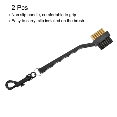 This golf brush efficiently cleans grooves on clubs, balls, and shoes, serving as an essential golf bag accessory. Constructed from plastic, it features a dual-sided head: brass bristles for metal surfaces and nylon bristles for wood. The tool includes a plastic clip for bag attachment. Simply grip the brush and use its tapered tips to dislodge dirt from tight spaces. While its durable design ensures portability, caution is advised to avoid hand contact with bristle tips. Maintains equipment hygiene without interrupting gameplay through targeted, material-specific cleaning capabilities.