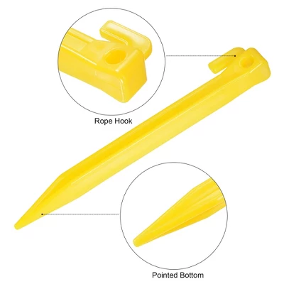 What is this?The tent stake is designed with a square top, which is convenient for hammering; there is a plastic rope hook with a hole on the top. Widely used in various places, such as beach, sand, lawn, soil and so on to fix your camping tent, canopy, picnic mat, rain tarps, fabric net, outdoor inflatable sofa, etc.What will I get?Material: PlasticHole Diameter: 7.5mm/0.3″Overall Size: 18cmx2.7cmx1.8cm / 7.1″x1.1″x0.7″(L*W*H)Package Content: 24 x Tent StakesAre there any advantages of the product?These plastic ground pegs are waterproof, windproof, corrosion-resistant, lightweight, easy to carry, durable and not easy to be bend. The pegs of bright color are easy to be found on the ground.How to use it?Fix the tent spike on the ground using a hammer or hard object. If you want to take out it, you can use a hammer with a hook to pull it out.What should I notice?Please be careful with your hands when using these ground pegs.