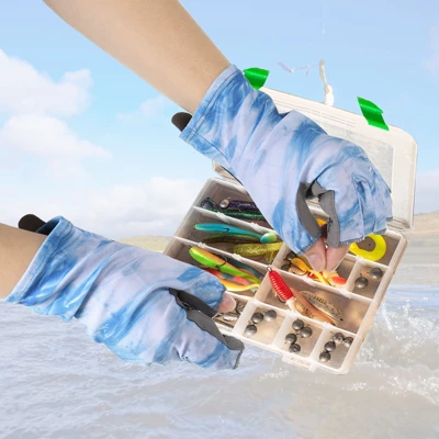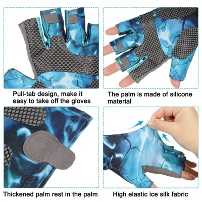 These fishing gloves are designed for a natural, comfortable fit, suitable for various outdoor activities requiring dexterity. They are crafted from ice silk fabric, providing elasticity and comfort for fishing in hot summer conditions. The gloves offer high sun protection and breathability, ensuring hands stay dry. A convenient pull-tab design allows easy wearing and removal, even when wet. The silicone palm features a thickened pad and reinforced wear points, enhancing durability and providing anti-slip, wear-resistant, and shock-absorbing properties. Good for kayaking, fishing trips, surf fishing, and more.