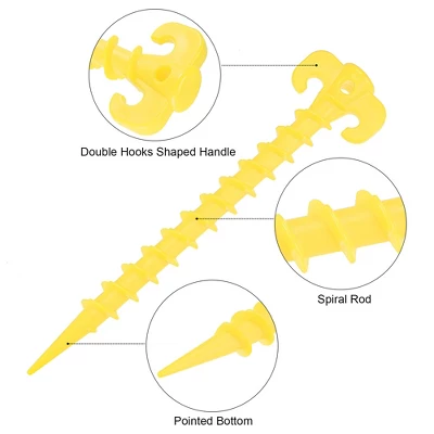What is this?The tent stake is designed with a handle of double hooks shaped, which is convenient for grasping. The pointed bottom and spiral rod make the stake easier to nail into the ground and grip more tightly. Widely used in various places, such as beach, sand, lawn, soil and so on to fix your camping tent, picnic mat, rain tarps, canopy, fabric net, outdoor inflatable sofa, etc.What will I get?Material: PlasticType: SpiralOverall Size: 20cmx4.6cm / 7.9″x1.8″(L*W)Screw Diameter: 16mm / 0.63″Hole Diameter: 6.5mm/0.26″Package Content: 4 x Tent StakesAre there any advantages of the product?These plastic ground pegs are waterproof, windproof, corrosion-resistant, lightweight, easy to carry, durable and not easy to be bend. The pegs of bright color are easy to be found on the ground.How to use it?Hold the handle of the tent stake and turn it clockwise, nail the stake into the ground, then hang the windproof rope on the handle. If you want to take out the stake, you can rotate the handle counterclockwise and pull it out.What should I notice?Please be careful with your hands when using these ground pegs.