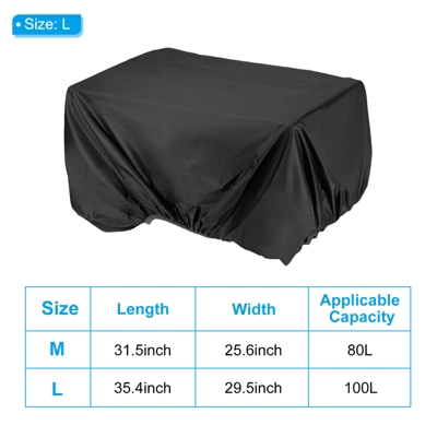 This bicycle rear rack rain cover is designed to keep your belongings dry and clean during outdoor adventures. Made from 190T polyester, it offers waterproof and wear-resistant properties, ensuring durability and easy maintenance. The interior coating enhances sun protection and water resistance, making it more effective than regular waterproof covers. Its seamless construction provides weatherproof protection, safeguarding your bike trunk bags from rain, mud, and dust. The lightweight design and compact size make it a convenient addition to your cycling gear. Suitable for mountain bikes, road bikes, hybrid bicycles, BMX, and folding cycling, this cover is an essential accessory for any cyclist. Size: L Size: 35.4×29.5 Inch(LxW), 100 L Capacity; M Size: 31.5×25.6 Inch(LxW), 80 L Capacity.