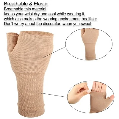 Features:Our wrist sleeve provides compression and improves circulation, helping to restore joints and muscles and ease common wrist pain symptoms such as arthritis, osteoporosis, tendonitis, carpal tunnel, and sprains.Made of quality material, keeps you comfortable, provides the right amount of stretch and snug fit to your hands, and breathable high performance fabric keeps an optimal joint temperature.Nice to your wrist and is easy to slip on and off without rubbing or irritating your wrist.Please Note:Fits both left and right wrists; Both men and women can wear it. Fit for both adult and old people, male and female.Everyone has differences in wrist size, pls measure the size of the smallest circle of your wrist. Because this product has a certain compressive force, it is tighter than ordinary wrist straps. This is completely designed to provide support for the wrist. So it may look the same, but in fact, different sizes are different.If you buy this product for hand recovery, and you want to have a strong compression force to provide support for your hands, choose the corresponding size according to our size chart. If you are for hand recovery and support but do not want such strong compression, you can choose a larger size. If you want to give your hands a certain amount of support, and you really hope for daily use, and you don’t want it too tight, please choose 2 sizes larger.Specifications:Product Name: Wrist Support SleevesMaterial: Nylon SpandexQuantity: 1 PairPackage List: 1 Pair Wrist Support Sleeves